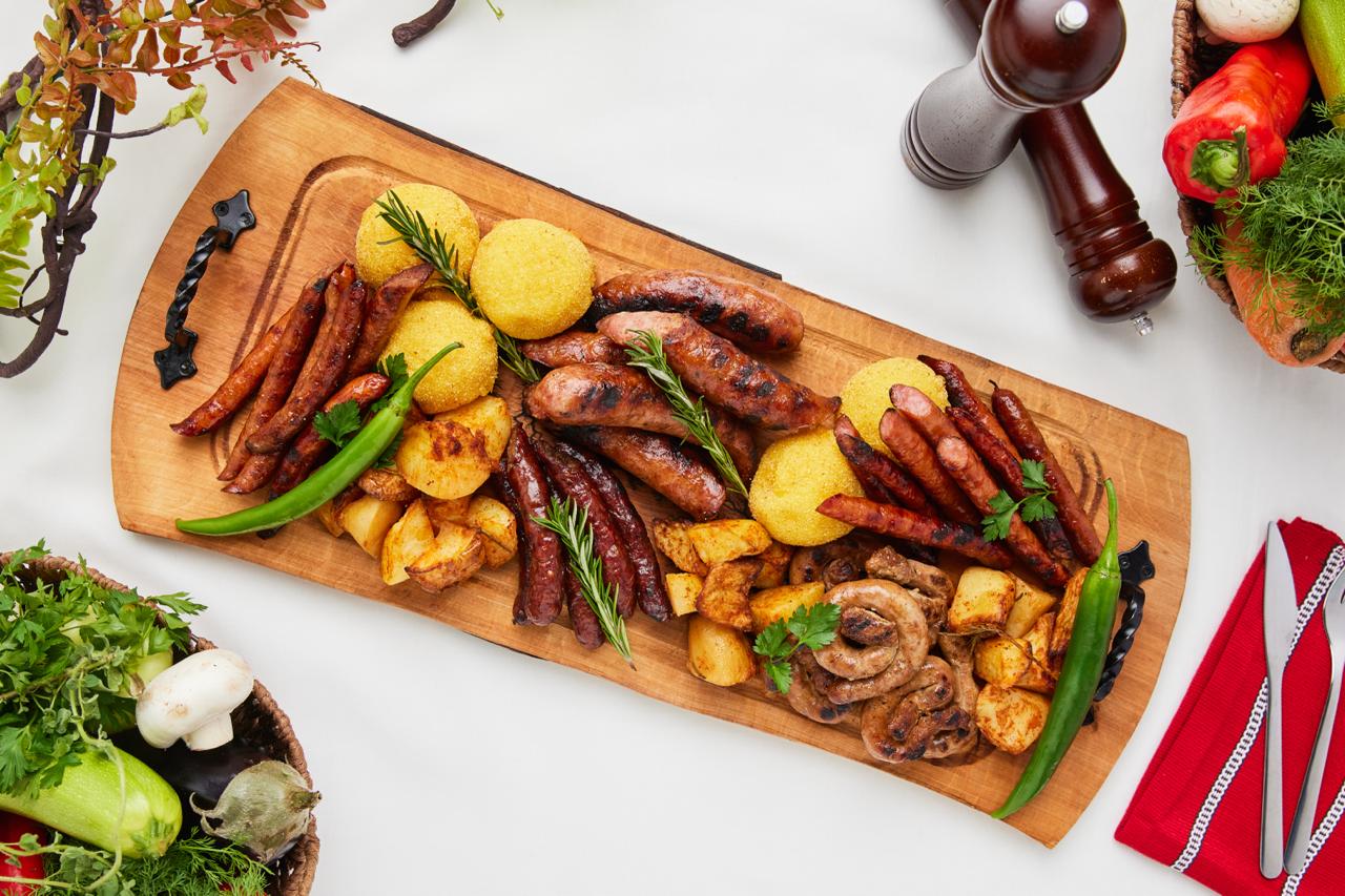 carnati Secuiesti (porc), carnaciori Gratarel (porc), carnati proapeti porc, carnati de Plescoi (vita si oaie), bulz, cartofi la cuptor